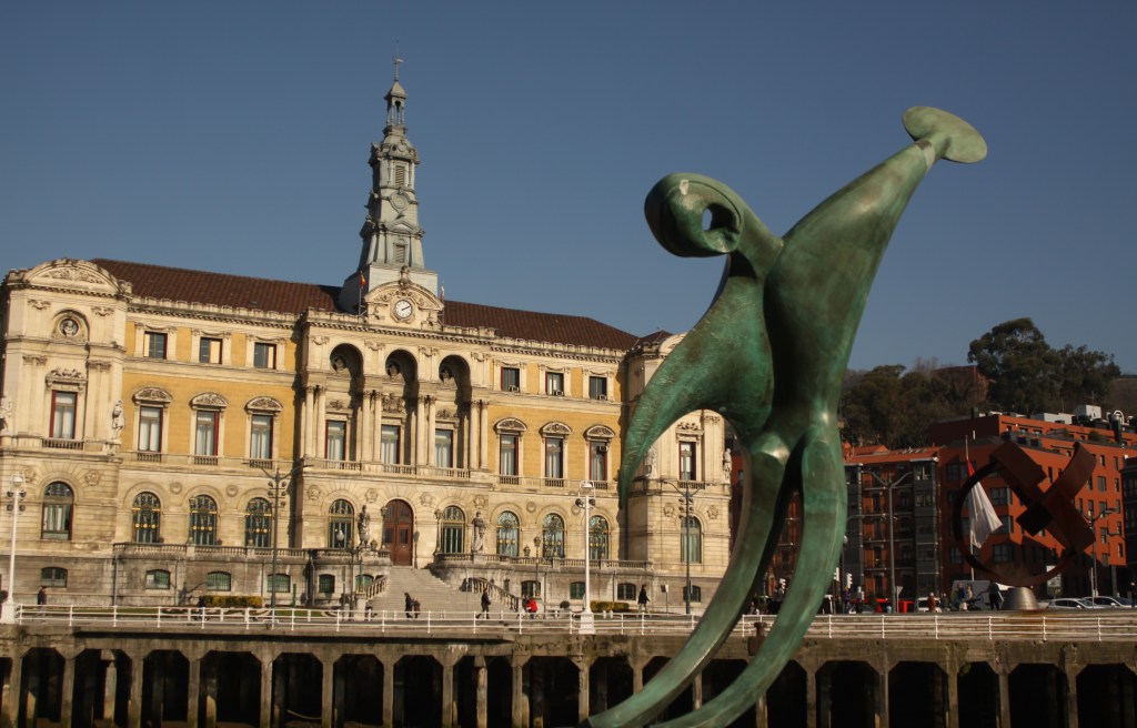 Desde la margen izquierda de la Ría, frente al Ayuntamiento, Bilbao, Biskaia, Euskadi, España, enero de 2018